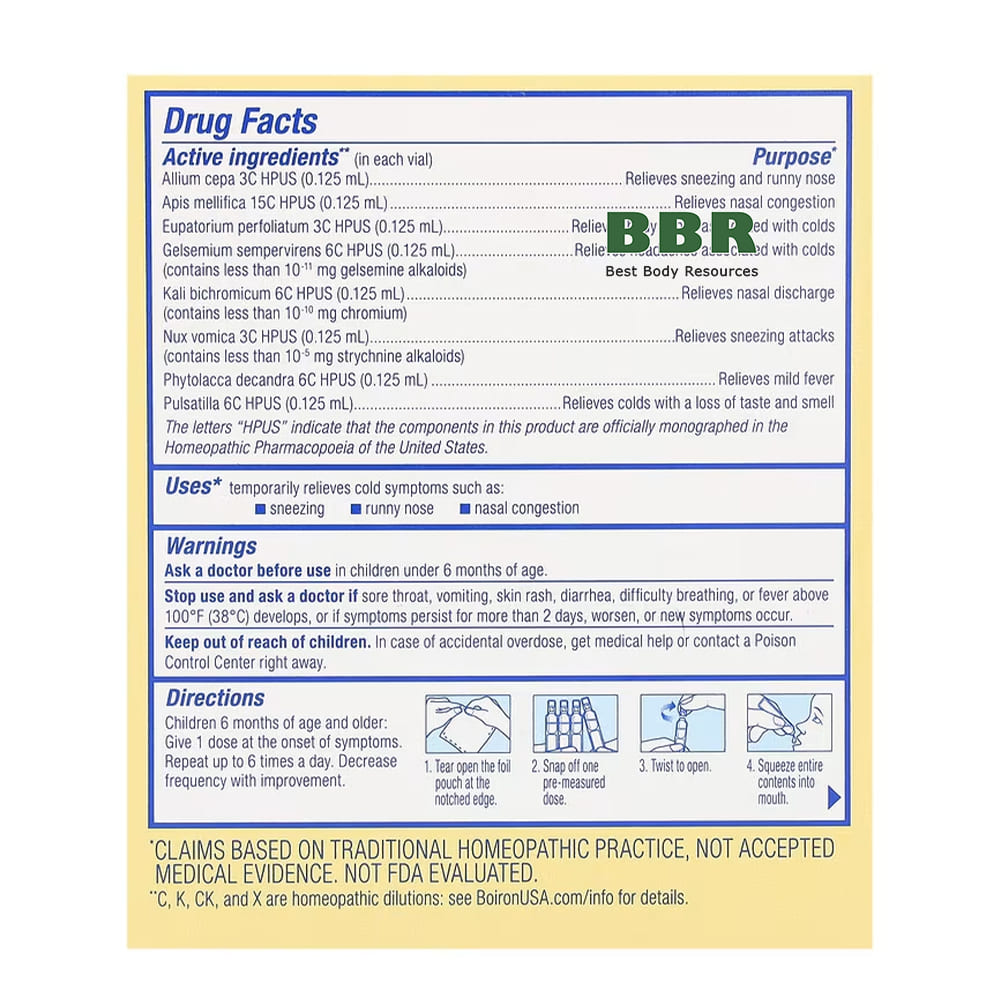 - Gelsemium sempervirens 6C HPUS (0,125 мл) – Облегчает головную боль, связанную с простудой (содержит менее 10⁻¹¹ мг гельсеминовых алкалоидов)