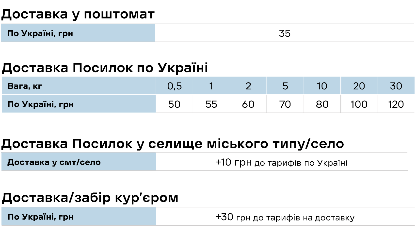 - Доставку оплачує одержувач згідно з тарифами, які наведені в таблиці. На замовлення від 3000 грн – доставка БЕЗКОШТОВНА;