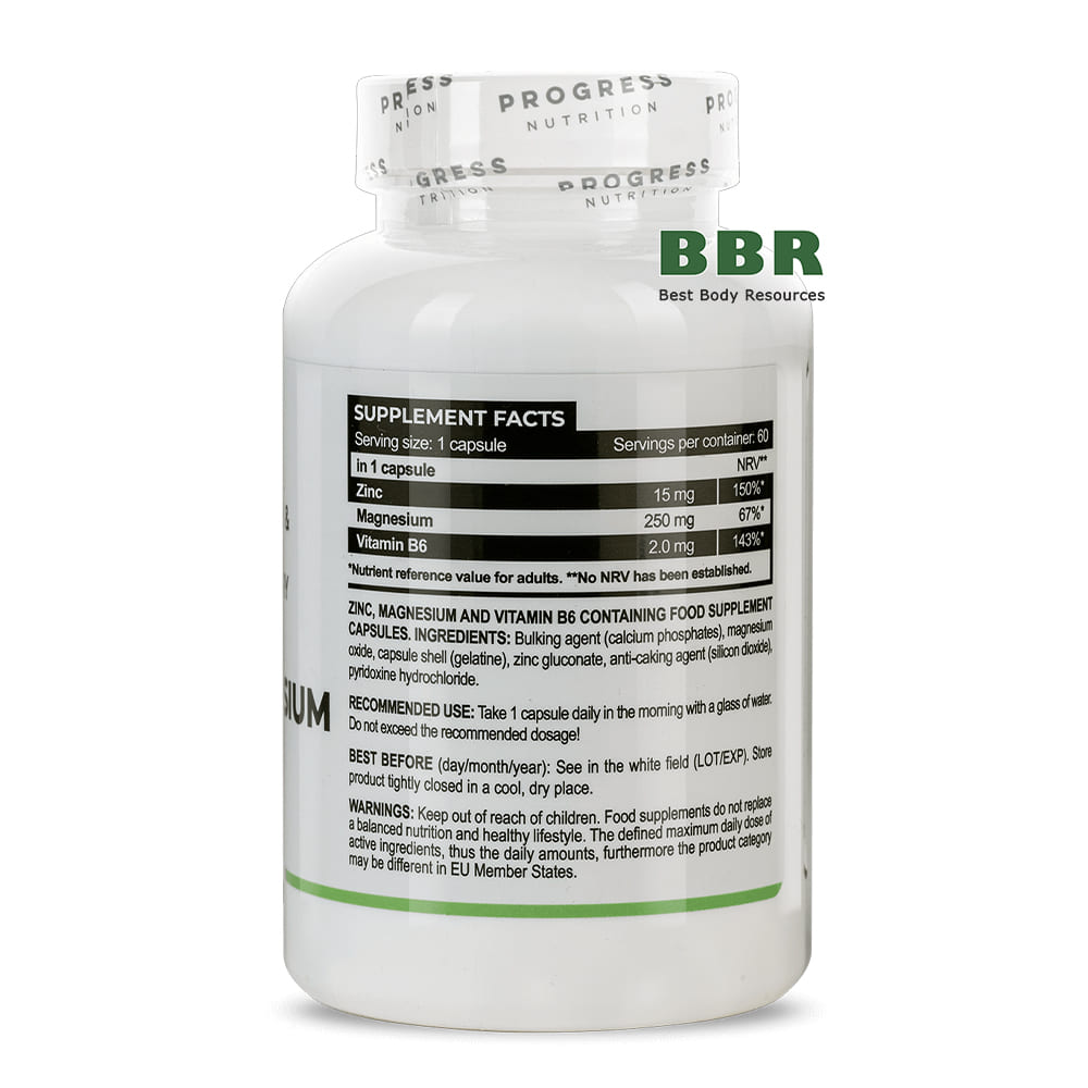 Приймайте по 1 капсулі щодня зранку, запиваючи склянкою води. Не перевищуйте рекомендоване дозування.Склад Zinc Magnesium & Vitamin B6 60 Caps, Progress Nutrition